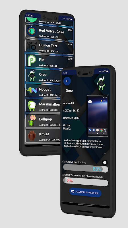 ابحث بسهولة عن إصدار من خلال sdk / codename / أو سنة فقط للبحث عن الهاتف الذي تم إصداره في ذلك العام أو ربما تريد معرفة التوزيع التراكمي وحصة السوق لهذا الإصدار.