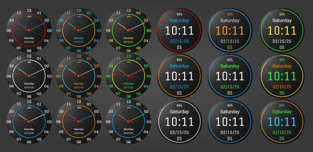 • سمات الألوان: سيكون لديك 9 سمات ألوان للاختيار من بينها لتغيير مظهر الساعة.