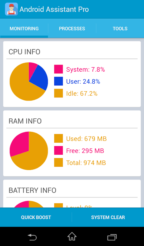1. Monitor status (CPU, RAM, ROM, SD card, Battery)