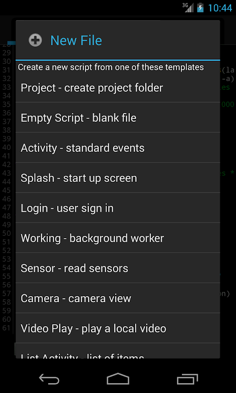 • Templates - start with activity, splash, background worker, sensor, camera, video play, list activity, text to speech, recognize speech, audio recorder and video recorder or choose an empty script.