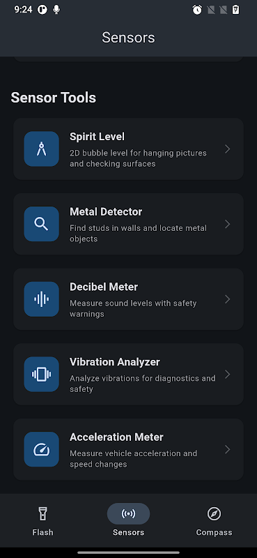 حوّل هاتفك إلى مجموعة أدوات متكاملة - مقياس صوت، وميزان تسوية، وجهاز كشف معادن، وبوصلة، ومصباح يدوي، وأكثر من 15 أداة استشعار، كل ذلك في تطبيق واحد مجاني.