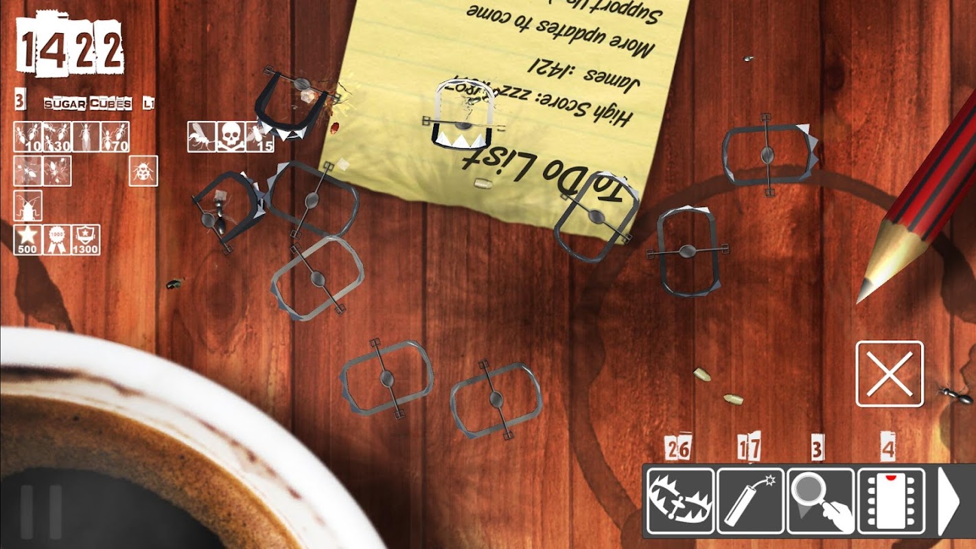 All sorts of bugs, flies and ants that love snacks and will try take it from you! Squash,Splat and Squish them and don't let that happen!! when you run out of sugar the game is over!