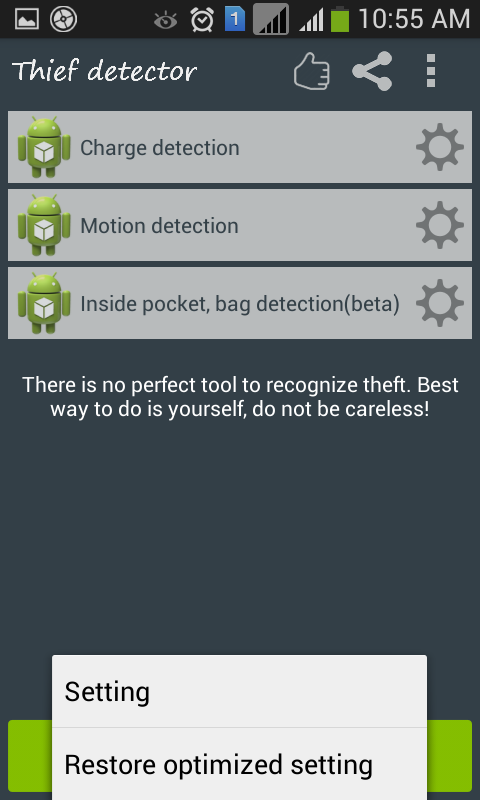 Once this feature is selected, any purpose to steal the phone (make it move out from current position) will be detected. The police alert sound will be trigged.