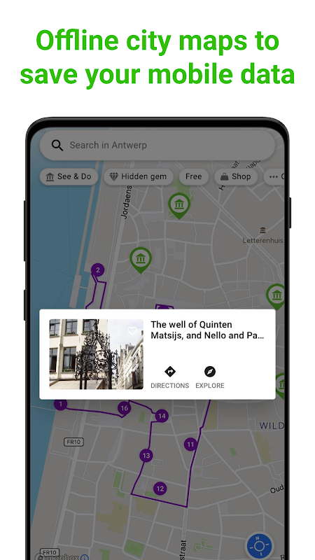 لن يسمح لك SmartGuide بالضياع ولن تفوتك أي مشاهد يجب مشاهدتها. يستخدم SmartGuide نظام الملاحة عبر نظام تحديد المواقع العالمي (GPS) لإرشادك حول مدينة أنتويرب بالشكل الذي يناسبك وبالسرعة التي تناسبك. المعالم السياحية للمسافر الحديث.