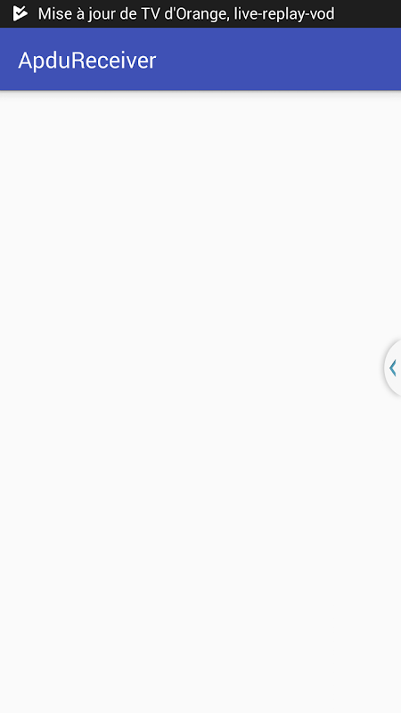 Application permettant la lecture d'APDU. En rapprochant le téléphone, avec l'application lancée, d'un appareil NFC emmenant un APDU de "SELECT", l'application affiche les APDU échangées.