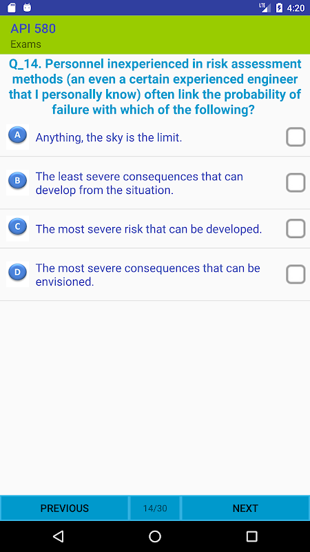 This Free version has 16 practice and 15 exam questions to show you the general view of the app. The full Exams version includes more than 600 questions that cover the whole sections of API 580 Examination