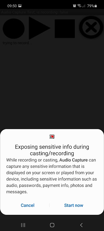 3. The user must tap "Start now" in order for a capturing session to be started. A permanent notification will be displayed in the status bar until the recording is stopped.