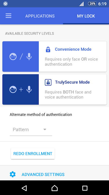 الإعداد السريع والبسيط: التسجيل سريع وسهل. أولاً ، اختر إحدى عبارات إلغاء الاشتراك الثلاثة المحددة مسبقًا أو أنشئ عبارة إلغاء القفل المخصصة الخاصة بك. بعد ذلك ، في بضع ثوانٍ فقط ، يمكنك تسجيل كل من وجهك وصوتك بمجرد النظر إلى هاتفك أثناء نطق عبارة المرور التي اخترتها في المطالبات. اختر التطبيقات التي تريد قفلها ، ومستوى الأمان المطلوب استخدامه لكل تطبيق ، ثم انتهيت. باستخدام AppLock ، يمكنك قفل كل تطبيق باستخدام وضع الملاءمة ، والذي يتطلب فقط فتح الوجه أو الصوت فقط أو وضع TrulySecure ، لتطبيقاتك الأكثر خصوصية ، والتي تتطلب أن يفتح الوجه والصوت. هذا هو TrulySecure!
