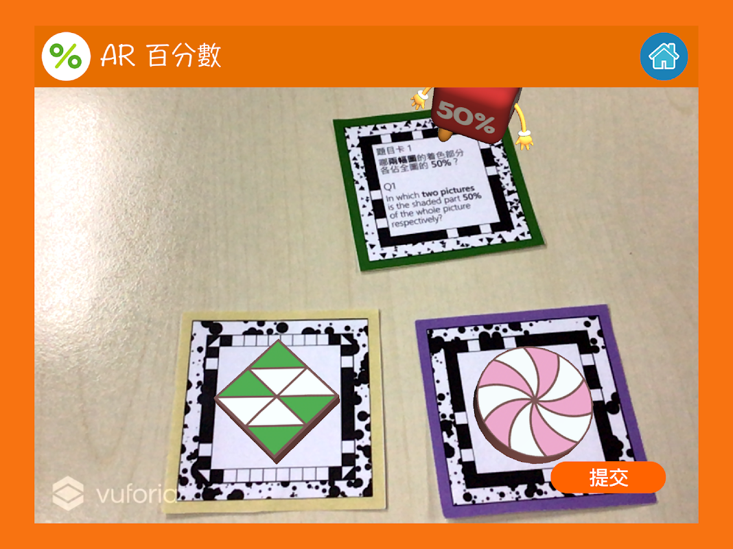 使用應用程式時需要配合AR 百分數的認識專屬的AR 活動卡使用,透過將正確的問題卡及答案卡配對來增強同學對百分數的辨別能力。務求做到幫助老師教學的同時,亦能夠滿足讓學生在家中自學的需要。