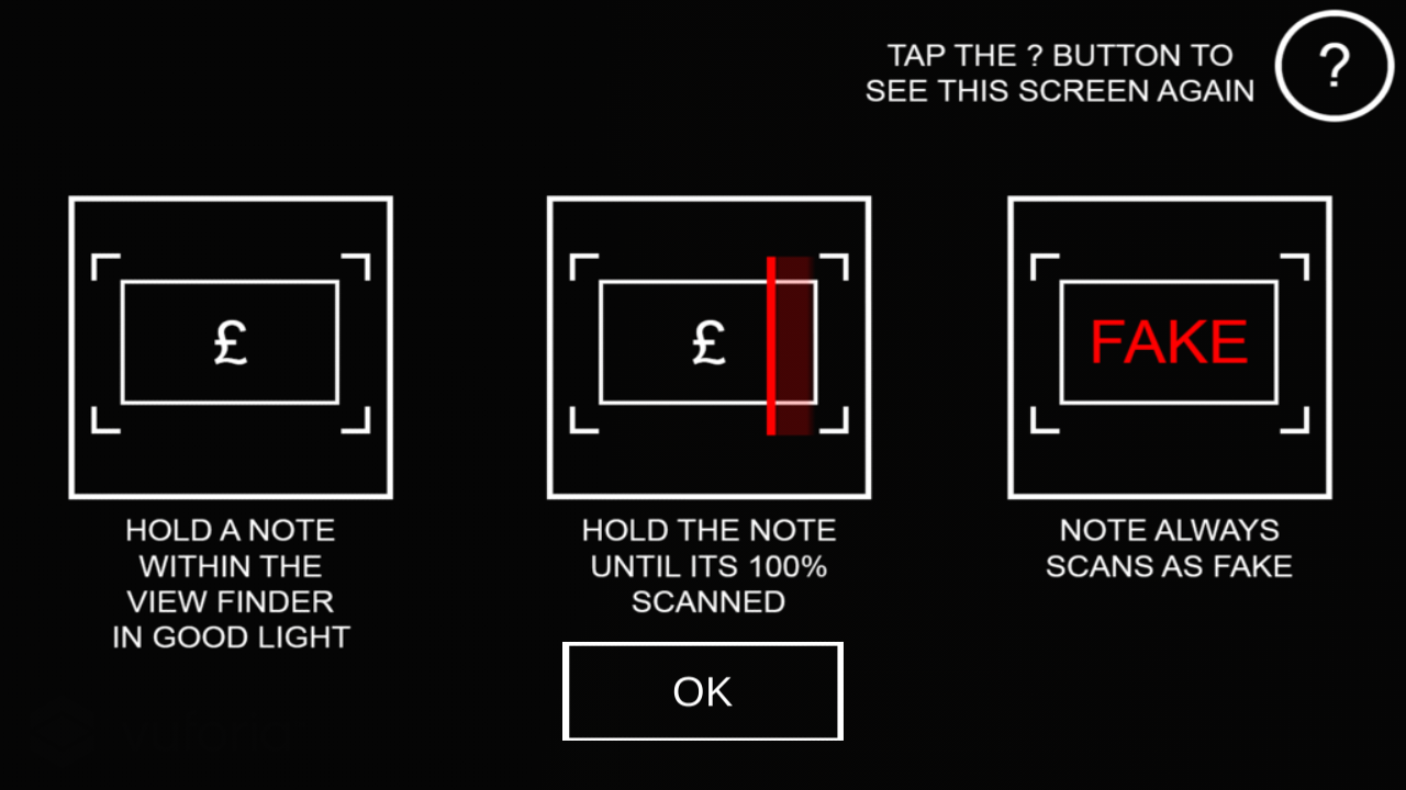This is an AR (Augmented Reality) app which scans your money when you hold it up to the camera. Just hold the note in the view finder area in good light.