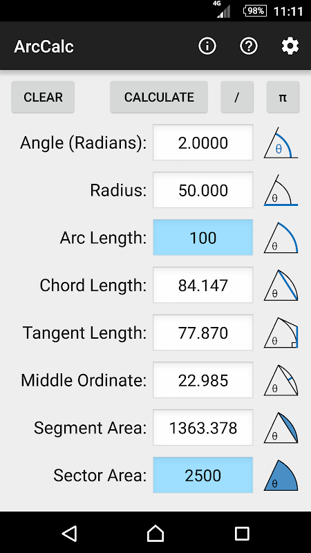 مع قيمتين كل التفاصيل المتبقية من قوس يمكن حساب. تدعم حاليا 21 مجموعات من: زاوية، الشعاع، وقوس طول، طول الحبل، الظل طول، تنسيق الأوسط، الجزء المساحة والمساحة القطاع. تركيبات الوحيدة التي لا يمكن أن يحسب لها كمية لا حصر له من حلول.