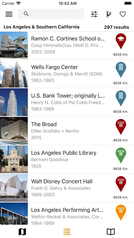 يحتوي ArchiMaps على وضعي تنقل رئيسيين: الخريطة والقائمة. تتيح لك الخريطة البحث في أعمال الهندسة المعمارية حسب موقعها الجغرافي وربطها بموقعك الخاص ؛ تعرض القائمة المباني مرتبة حسب القرب أو التاريخ أو حسب الترتيب الأبجدي. من كلاهما ، يمكنك الوصول إلى شاشة الحقائق من كل عمل الهندسة المعمارية.