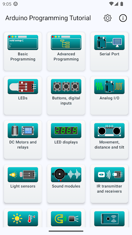 يوفر التطبيق دروسًا مفصلة وأدلة توصيل لمجموعة واسعة من مكونات الأجهزة الشائعة الاستخدام مع أردوينو، بما في ذلك: