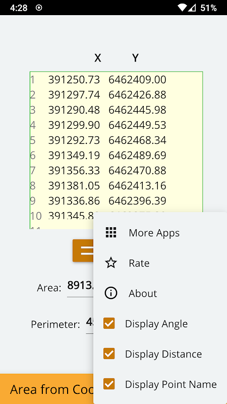يمكنك حساب وعرض المنطقة والمحيط من الإحداثيات. يمكنك أيضًا رؤية أرقام النقاط وطول كل جانب وزاوية كل زاوية على شكل المنطقة. لحساب المنطقة ، يمكنك ترقيم الرؤوس بالترتيب في اتجاه عقارب الساعة أو عكس اتجاه عقارب الساعة. بعد كتابة إحداثيات المنطقة على التوالي ، اضغط على زر الحساب لرؤية النتائج. أسفل الحساب ، يمكنك رؤية شكل المنطقة. وهو يدعم الوحدات الدولية مثل متر ، ياردة ، هكتار ، فدان ، قدم .. يجب أن يكون الفاصل بين أزواج إحداثيات الإدخال مسافة أو فاصلة.
