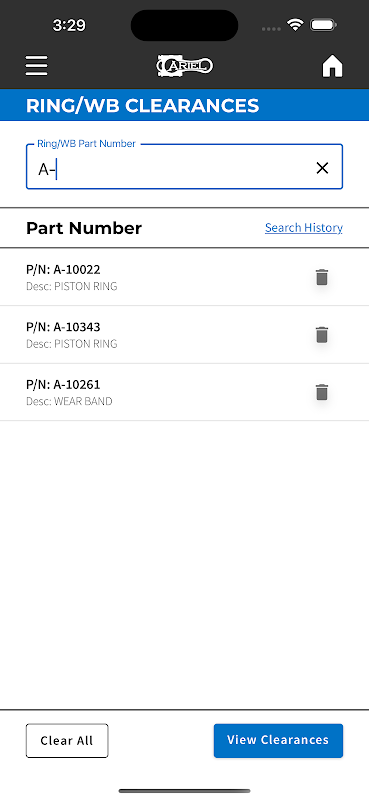 • العثور على قيم الخلوص لحلقات المكبس، وحلقات الراكب، وحزام التآكل بناءً على أرقام القطع.
