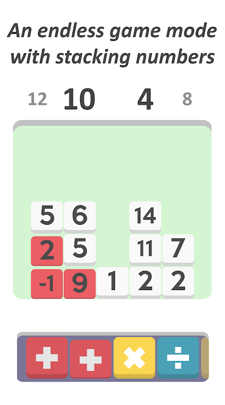 Stacks: وضع لعبة لا نهاية لها حيث تضيف كل خطوة تقوم بها مزيدًا من الأرقام إلى المستوى. جعل الأهداف ويسجل المجموعات لتدمير صفوف من الأرقام للحفاظ على البقاء والحصول على درجة عالية جديدة!
