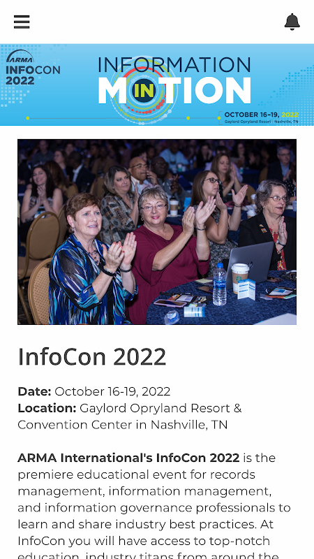 The ARMA InfoCon 2022 app is designed to help you build your personal schedule of educational sessions, network with other attendees and learn about our Business Partners. Features include: - Build a personalized schedule of sessions to attend - Connect and schedule meetings with attendees - Map out and make a list of Business Partners to meet. Please note that this community is exclusively for ARMA InfoCon 2022 attendees, and you will be able to use it before, during, and after the event concludes.