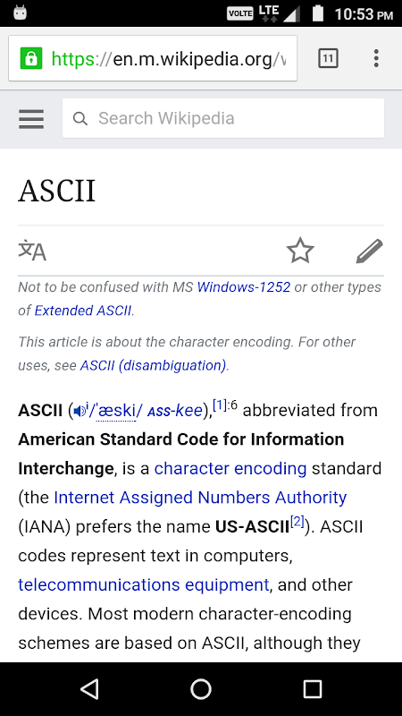 The info button 'i' connects to Wikipedia page for more information on 'ASCII'.