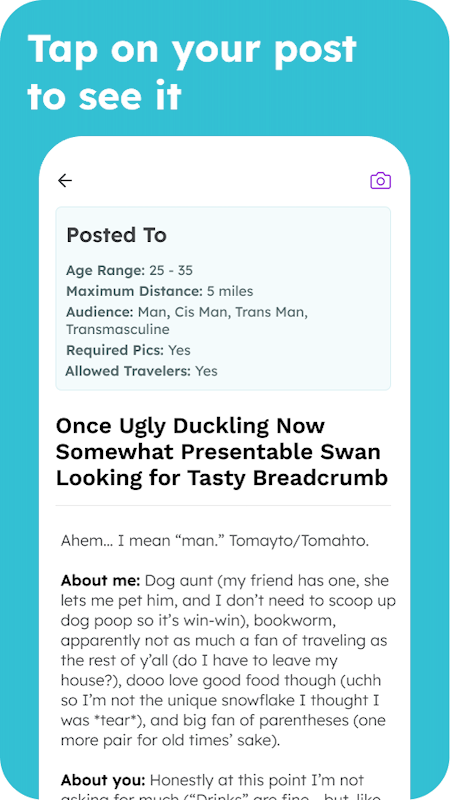 - إنشاء منشورات متعددة: نحن ندرك أنه يمكن للأشخاص الحصول على أكثر من طريقة للتعبير عن أنفسهم. ولهذا السبب نسمح بـ 7 منشورات نشطة في وقت واحد، ونقدم 6 فئات منشورات مختلفة للاختيار من بينها، ونسمح للمستخدمين بوضع علامة على منشوراتهم على أنها صديقة للشبكات إذا رغبوا في ذلك