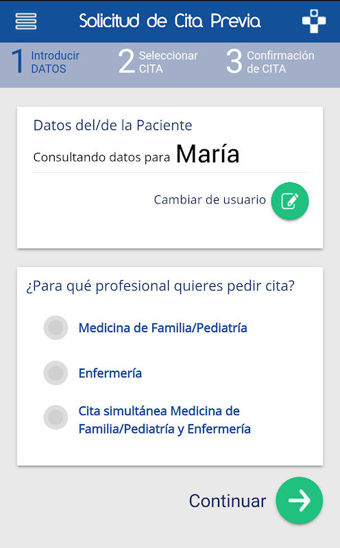 يسمح لك باستشارة وإلغاء المواعيد مع تمريض الرعاية الأولية وطب الأسرة وخدمات طب الأطفال (باستثناء الفحوصات المنتظمة للأطفال الأصحاء) ، وكذلك مع وحدة الإدارة في المركز الصحي الخاص بك ، مما يتيح لك الاختيار في جميع الحالات بين المواعيد وجهاً لوجه والمواعيد الهاتفية.