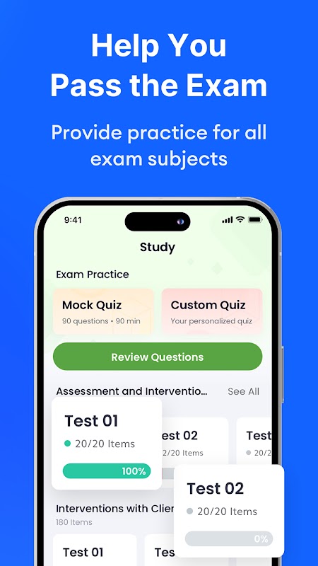 MSW هو اختصار لـ ASWB Master's Social Work Certification Exam، وهو مخصص للأخصائيين الاجتماعيين الذين تخرجوا حديثًا من برنامج الماجستير في العمل الاجتماعي ويسعون لاكتساب خبرة عملية للحصول على ترخيص أعلى. تطبيقنا لا يدعم فقط التحضير لهذين الامتحانين بشكل مثالي، بل يُسهّل عليك أيضًا اجتيازهما من خلال التصميم الاحترافي لخبراء الامتحانات!