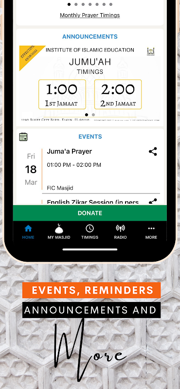 انقر فوق المسجد لعرض الأحداث والإعلانات والتذكيرات أو حتى التبرع للمسجد. احفظ المساجد الأكثر زيارة كمفضلة. ضبط تذكير الإقامة ولا تفوت صلاة الجماعة مرة أخرى.
