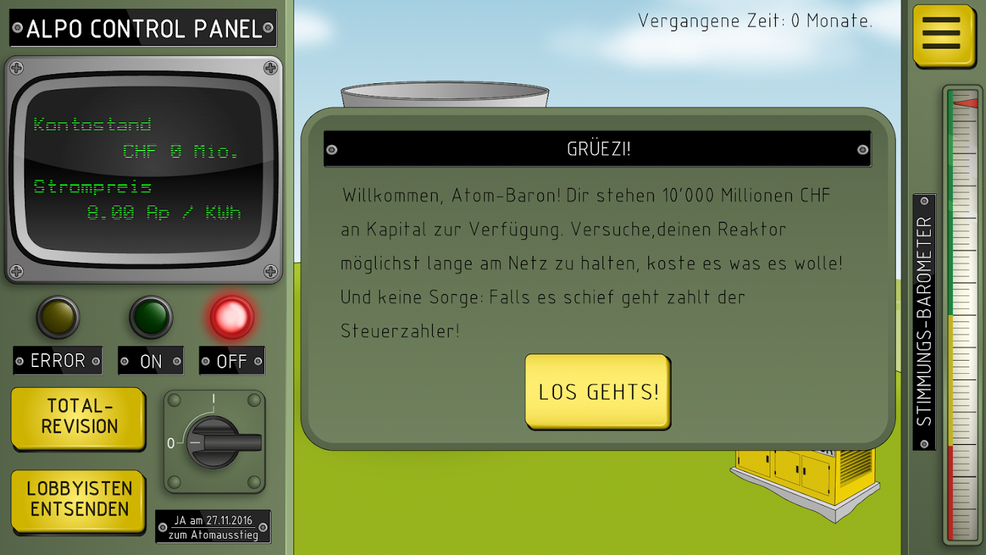 Hier schlüpfst du in die Rolle eines Schweizer AKW Chefs und versuchst möglichst viel Geld mit dreckigem Atomstrom zu verdienen. Aber Achtung: es kommen stets verschiedenste Gefahren auf dich und dein AKW zu. Es liegt nun an dir, dafür zu sorgen, dass keine Kernschmelze eintritt. Kleiner Tipp: der sichere Betrieb deines Kraftwerkes steht hier nicht im Vordergrund. Es geht nur darum, dein Kraftwerk möglichst lange am Netz zu halten, koste es was es wolle.... So wie im echten Leben halt.