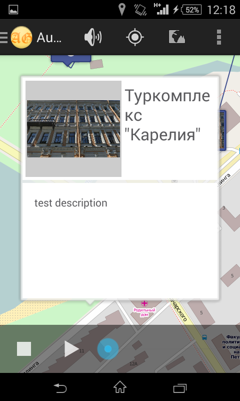 سيقوم التطبيق يوفر الوصول إلى التخزين أدلة الصوت. يتم تخزين علامات جيو وصلات إلى المسارات الصوتية إلى منصة مفتوحة المصدر LBS Geo2tag.