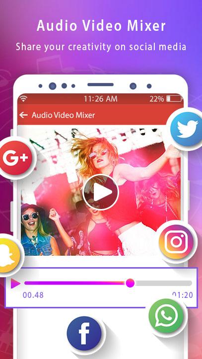 يوفر Audio Video Mixer وسيلة لتغيير الموسيقى الخلفية لأي ملفات فيديو. خلاط الصوت والفيديو هو نوع واحد من التطبيق محرر الفيديو. باستخدام هذا التطبيق ، يمكنك إضافة أو خلط ملفات الصوت المفضلة إلى ملفات الفيديو. يدير هذا التطبيق حجم ملف الصوت إذا كان طول ملف الصوت أكبر من ملفات الفيديو ، فسيتم تلقائيًا خفض الصوت إلى مدة الفيديو.