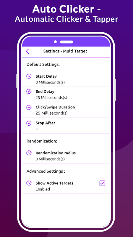 Auto Clicker - Automatic Clicker & Tapper has an adjustable target mode with which you can touch or move on any side in the mobile device to use this option most while you are playing a game and need to continues clicks on the game. just put target mode and tap on play button it will automatically start clicking. the app also allows the best option for users to set particular counts with your way.