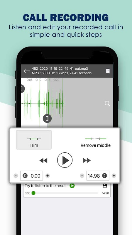 يوفر تطبيق تسجيل المكالمات هذا الراحة ويسمح لك بإدارة تسجيل صوتيات المكالمات. يتيح لك التطبيق الاستماع إلى التسجيلات وتحريرها وإضافة ملاحظات وحذفها وتقليمها ومشاركتها. يتيح لك التطبيق أيضًا حفظ جميع التسجيلات الصوتية المهمة والوصول إليها وقت الحاجة.