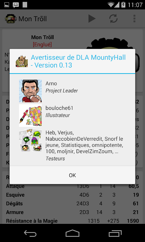 في نفس الوقت مثل DLA ، يسترجع التطبيق كمية معينة من المعلومات من Trõll ويعرضها عليك. يمكنك إذن الاطلاع على ملف تعريف Trõll الخاص بك (الاسم ، العرق ، المستوى ، شعار النبالة) ، خصائصه (ATT / ESQ / DEG / MM / RM / ...) وكذلك معلومات مفيدة: نقاط حياتك ، وضعك و وخاصة DLA الخاص بك وكذلك المناطق المحمية المتبقية.