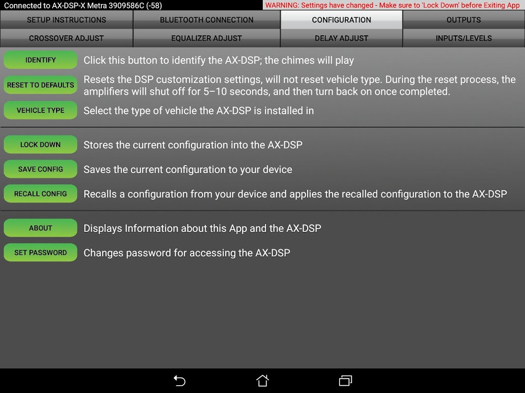 The AX-DSP-X App allows you to quickly and easily configure all of the AX-DSP-X's parameters via the Bluetooth interface on your phone or tablet. Its intuitive interface provides controls for: