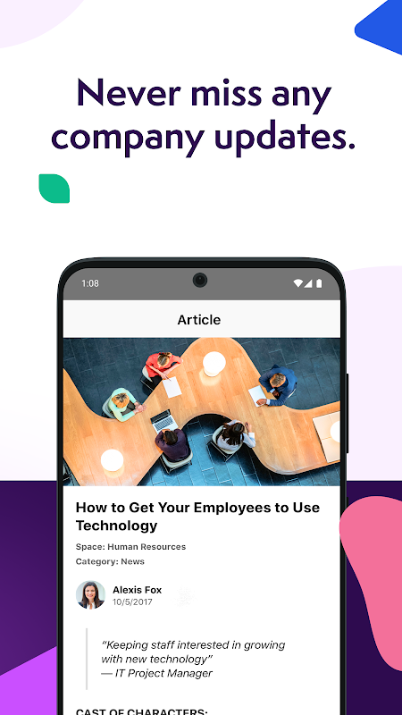 تصفح وافتح الملفات المهمة، وتعاون مع زملائك في الفريق في الوقت الفعلي، وابقَ على اطلاع دائم بأخبار الشركة ومحادثاتها - كل ذلك من راحة يدك. بفضل البحث السريع والواجهة سهلة الاستخدام، ستجد ما تحتاجه بسرعة وسهولة.