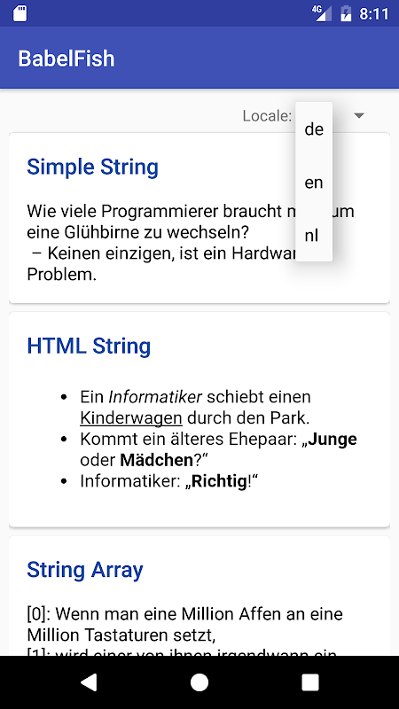 Proof of concept app to demonstrate string localization. Localizes regular strings, HTML strings, string arrays and plural strings with arguments.