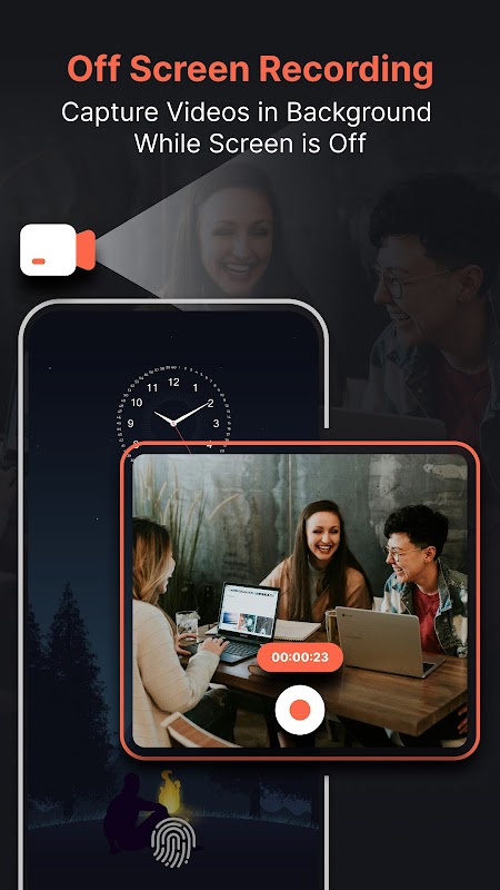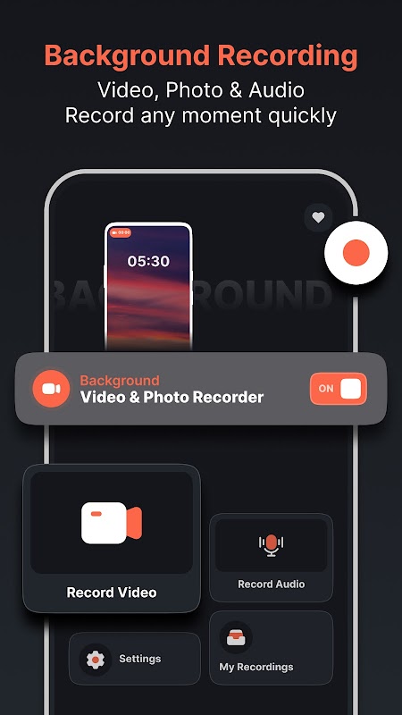 يتيح لك هذا التطبيق تسجيل مقاطع الفيديو والتسجيلات الصوتية والتقاط الصور بسهولة في أي وقت وفي أي مكان في الخلفية أثناء أداء مهام أخرى على جهازك، دون الحاجة إلى إبقاء الشاشة نشطة.