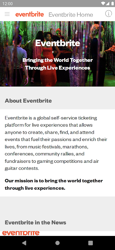 Eventbrite عبارة عن منصة عالمية لحجز التذاكر بالخدمة الذاتية للتجارب الحية التي تتيح لأي شخص إنشاء ومشاركة والعثور على وحضور الأحداث التي تغذي شغفه وتثري حياته. منذ تأسيسها في عام 2006، أعادت الشركة تصور التجارب الحية وتعمل بلا كلل لجمع العالم معًا، وفتح سحر الأحداث الحية، وزيادة الفرح الجماعي.