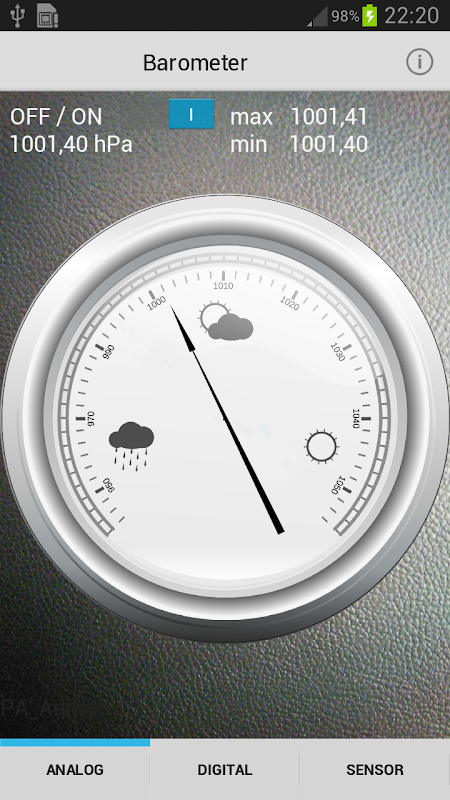 مقياسا يظهر الضغط الجوي الحالي. لهذا الغرض، يتم استخدام جهاز استشعار ضغط الهواء من الهاتف أو الكمبيوتر اللوحي.