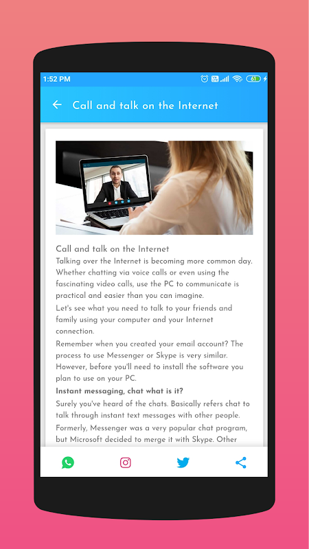 Basic Computer Knowledge Free application, you learn basic elements to use the computer, as well as the basic knowledge to navigate the Internet, use email, social networks and understand basic concepts of computer.