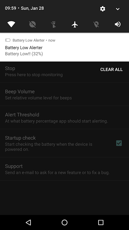 أنا أريد أن أترك هاتفي في كل ليلة تشغيل راديو الموجات القصيرة بلدي. في كثير من الأحيان عندما أستيقظ في الصباح، وبطارية على هاتفي ميتة. تنبيه البطارية الافتراضي المنخفض الذي يأتي مع هاتفي هو تنبيه واحد التي يمكن أن تضيع بسهولة. أنا في حاجة إلى آلية تنبيه أفضل حتى عندما بلدي بطارية الهاتف بالقرب من الميتة، وسوف تستيقظ لي حتى أتمكن من سد العجز في.