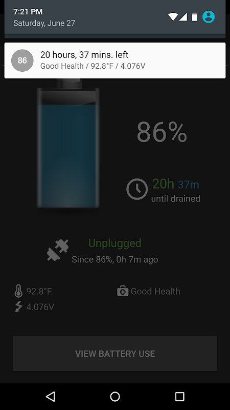 مراقبين BatteryBot ويظهر البطارية مستوى شحن (نسبة مئوية) كرمز في شريط الحالة، مع كم من الوقت كنت قد تركت، ودرجة الحرارة، والصحة، والجهد، والوقت توصيله منذ / موصول في منطقة الإعلام. أصبح لديها الآن أيضا القطعة 1X1 التطبيق. لديه نسخة برو أيضا أجهزة الإنذار المستخدم للتكوين، وسجلات والمعلومات الحالية مللي أمبير، و(4X1) القطعة الكبيرة.