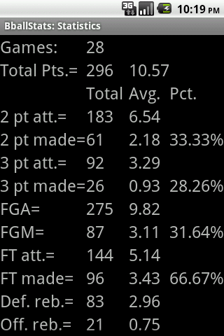 BballStats will track your player's basketball statistics across a game, a season, or career! Enter stats in real time during the action using a simple interface. Review the results in any grouping you desire. Click Menu->Help on the main menu to get started.