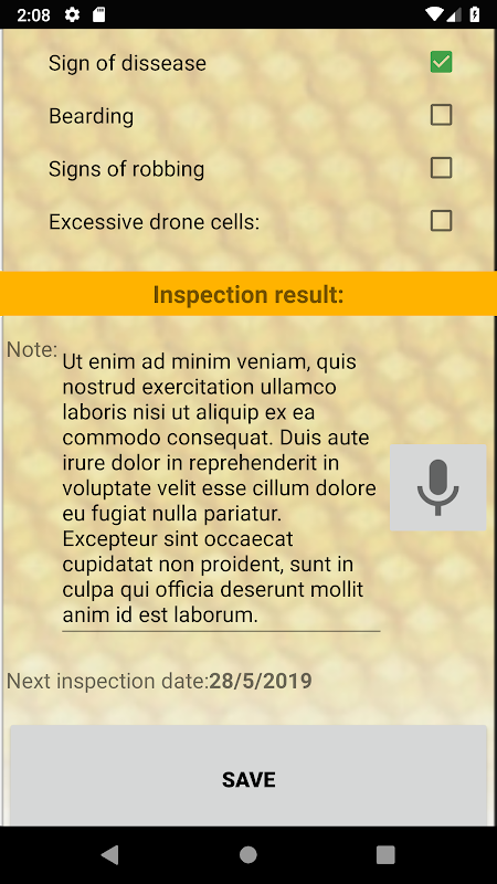 عند استخدام التطبيق ، مع مراعاة الظروف في المنحل ، من الممكن إدخال المعلومات عن طريق إجراء تحديدات من قائمة الاختيار المتعدد بدلاً من الكتابة بأكبر قدر ممكن. سيؤدي ذلك إلى زيادة السرعة وضمان المعلومات المتسقة.