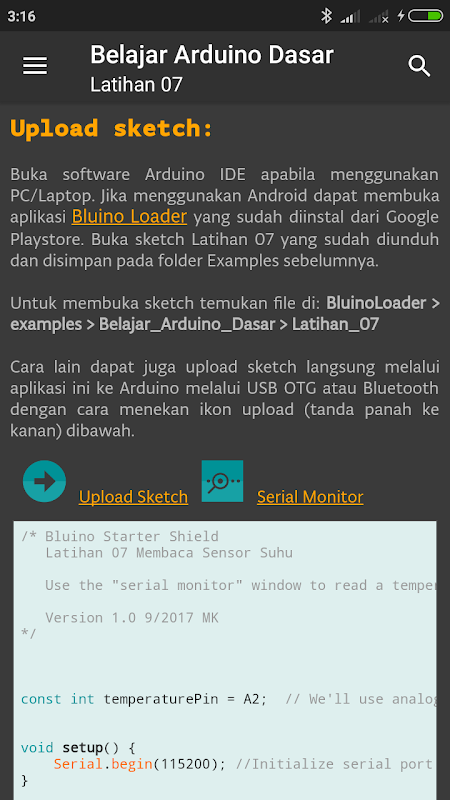 دروس لتعلم التطبيق الروبوت على أساس اردوينو. يمكنك قراءة كل وصف وتعلم الدائرة وكذلك رمز كل ممارسة البرنامج، كما أنها قادرة على ممارسة مباشرة عن طريق ملء في برنامج (تحميل ملف الهيكس) إلى مجلس اردوينو عن طريق USB / بلوتوث من هذا التطبيق. لممارسة هذا يتطلب التصحيح يمكنك استخدام مراقب المسلسل