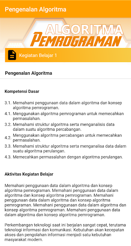 Aplikasi Belajar Pemrograman Dasar sebagai bahan pembelajaran bagi Anda yang memilih jurusan Teknik Komputer dan Informatika seperti TKJ, RPL dan MM. Adapun materi yang di bahasa adalah materi mata pelajaran Pemrograman Dasar SMK Kelas X semester 1 yang terdiri dari :