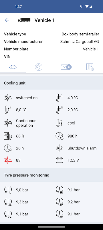 مع تطبيق beUpToDate ، لديك أسطول خاص بك في لمحة واحدة في جميع الأوقات. في العرض المتحرك للبوابة ، تحصل على رؤى مهمة حول أسطولك ، مثل الوضع وضغط الإطارات والتآكل والحمولة لكل مركبة. يتم إرسال الرسائل والإنذارات التي تم تكوينها مسبقًا في بوابة TrailerConnect مباشرة إلى هاتفك الذكي كرسالة نصية قصيرة أو في سجل الرسائل في التطبيق. يتيح لك ذلك الاستجابة بسرعة للأحداث المهمة وجعل إدارة أسطولك أكثر كفاءة.