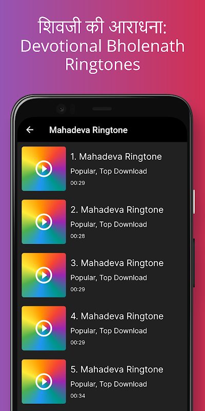 إذا كنت مغرمًا بأغاني Shiv Bhajans و Hindi Bhajans و bhajans الجديدة و Shiv لكنك تكافح للعثور على نغمات رنين مناسبة ، فإن تطبيق Mahadev Ringtone مثالي لك. يقدم مجموعة واسعة من نغمات الرنين المجانية ، مما يوفر لك تجربة موسيقية رائعة.