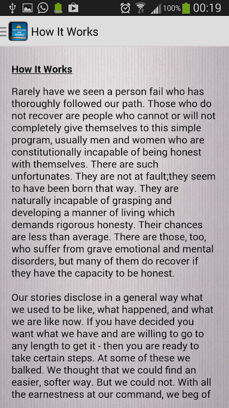 The all new App for The Big Book of Alcoholics Anonymous. Includes the first 164 pages. An added bonus as Dr. Bob's nightmare and Alcoholics Anonymous Number Three (Personal Stories)