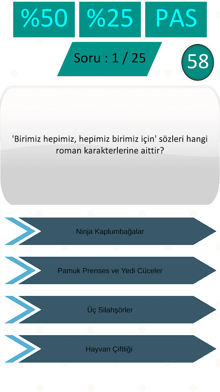 %50 joker hakkınız ile yanlış olan bir şık kaybolacaktır ve soruyu bilmeniz kolaylaşacaktır.
