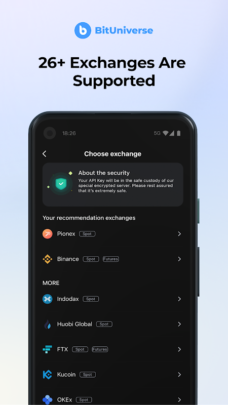 تمكن BitUniverse العملاء من التداول في أكثر من 26 بورصة مثل: